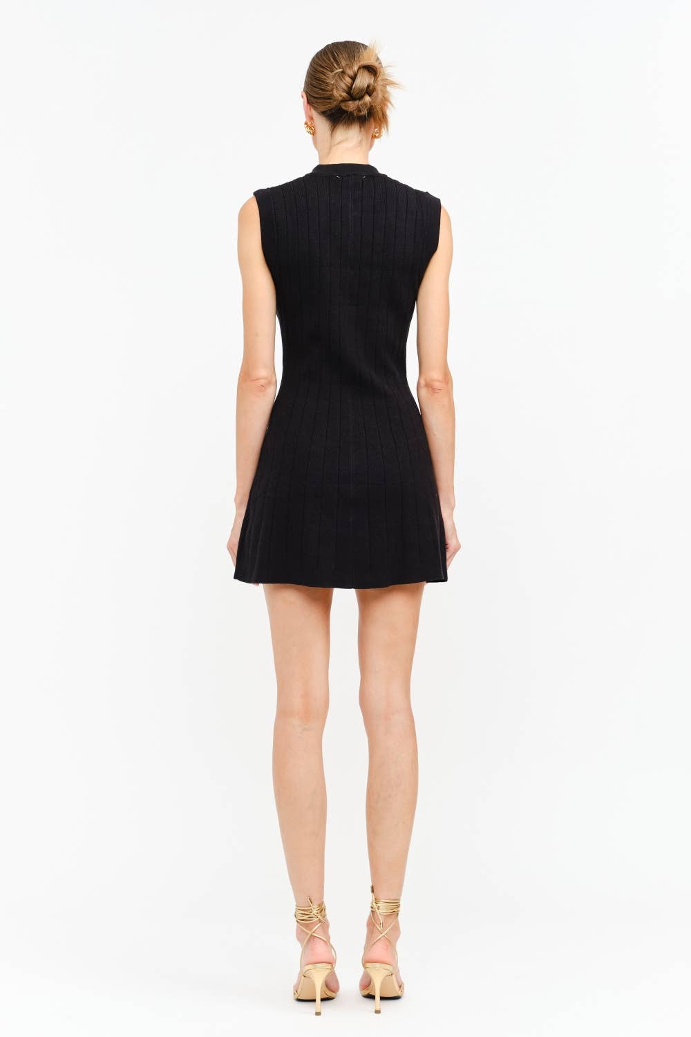 Carly Black Dress: Classic meets modern charm in this sleeveless knit mini dress. Designed with a flattering ribbed texture, gold button accents, and subtle pocket details, it's a piece that exudes quiet luxury while staying effortlessly wearable. - Black ribbed knit fabrication - Sleeveless mini silhouette - Gold button front detail - Pocket flap accents at waist - Pull-on style with stretch comfort Care Instructions: - Hand wash cold - Do not bleach - Line dry - Iron low if needed - Do not tumble dry Fabric Content: Self: 48% Viscose, 27% Polyester, 25% Nylon Model is 5'11" and is wearing a size small