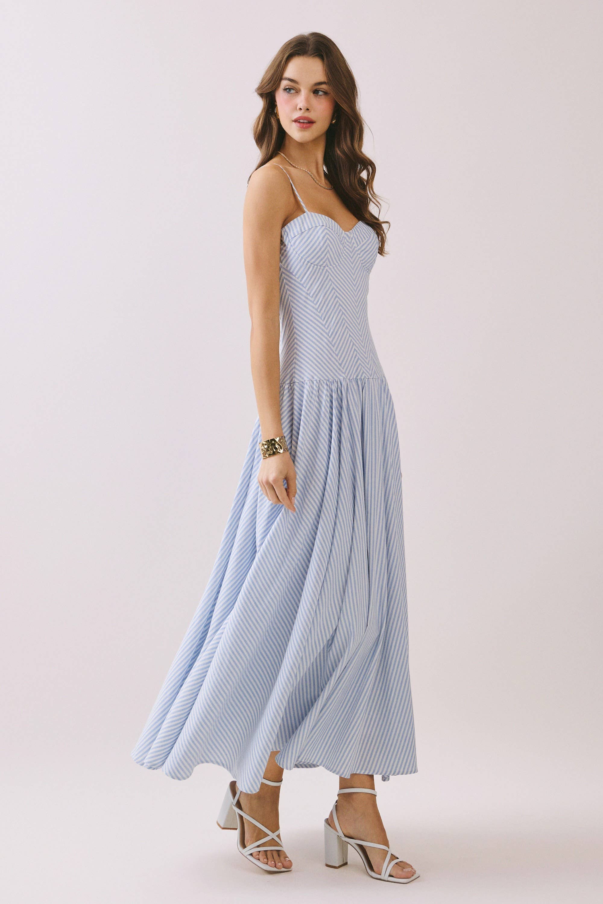 A striped maxi dress featuring a sweetheart neckline and a fitted, corset-style bodice with bust detail. Designed with adjustable spaghetti straps and a softly gathered drop-waist skirt for a flowy. Finished with a concealed back zipper closure. Model Size + Fit: Model height: 5'11" Dress size: Small Bust: 31.5 Waist: 23.5 Hips: 35
