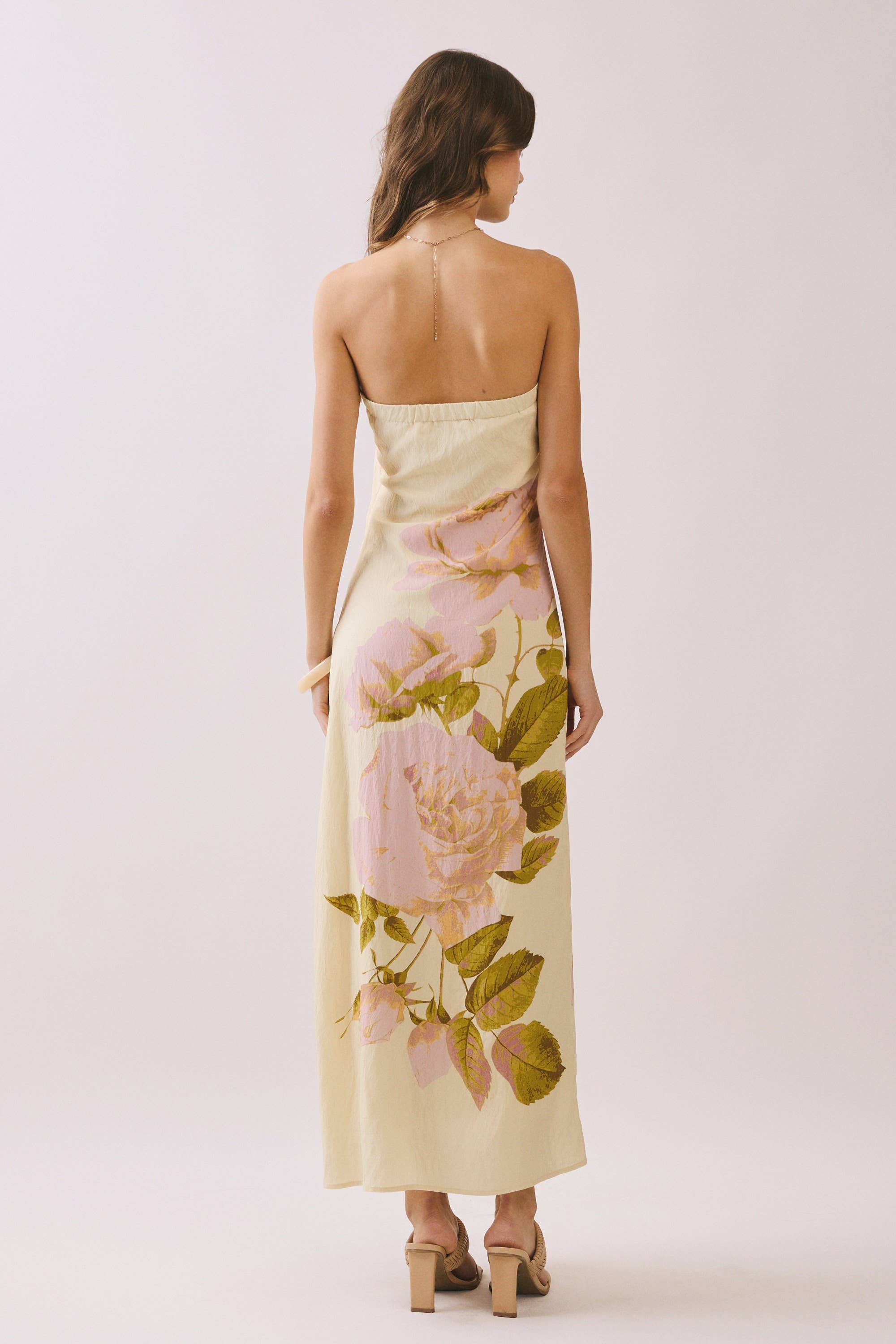 A strapless maxi dress featuring a bold, oversized floral print. Designed with a straight neckline and a sleek and finished with an elasticized back for added comfort and a secure fit.