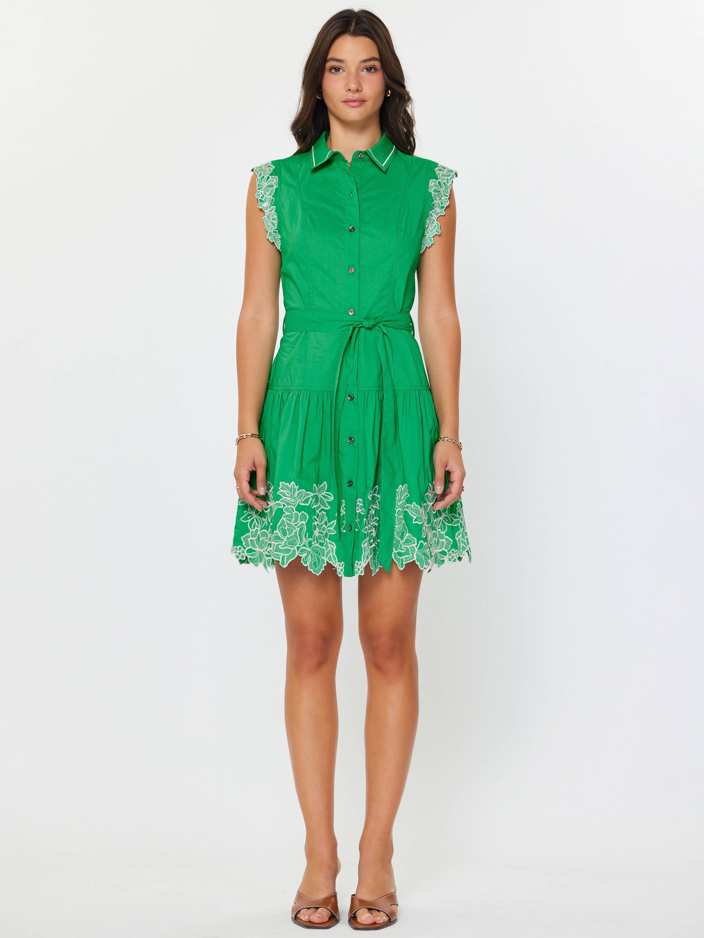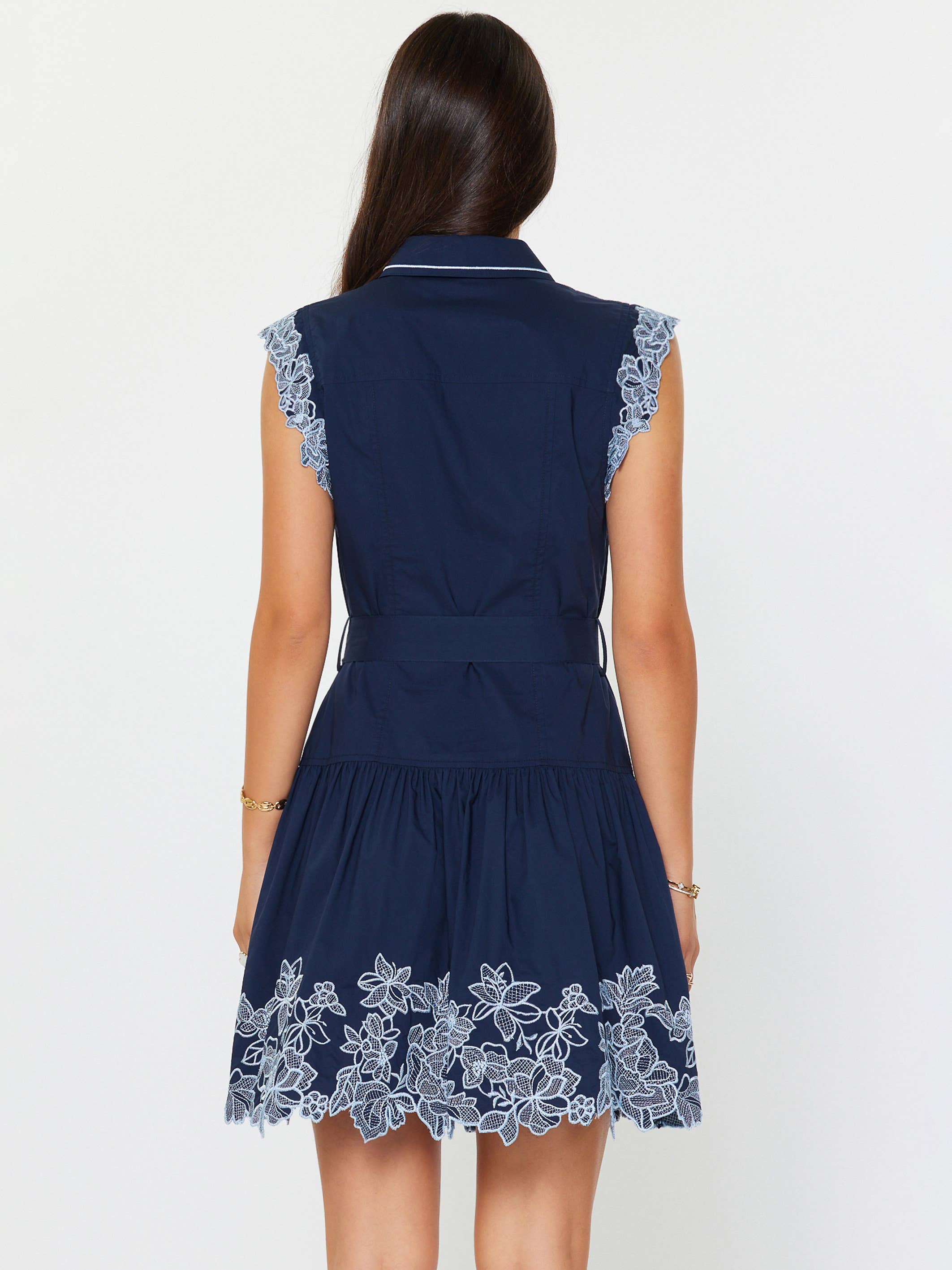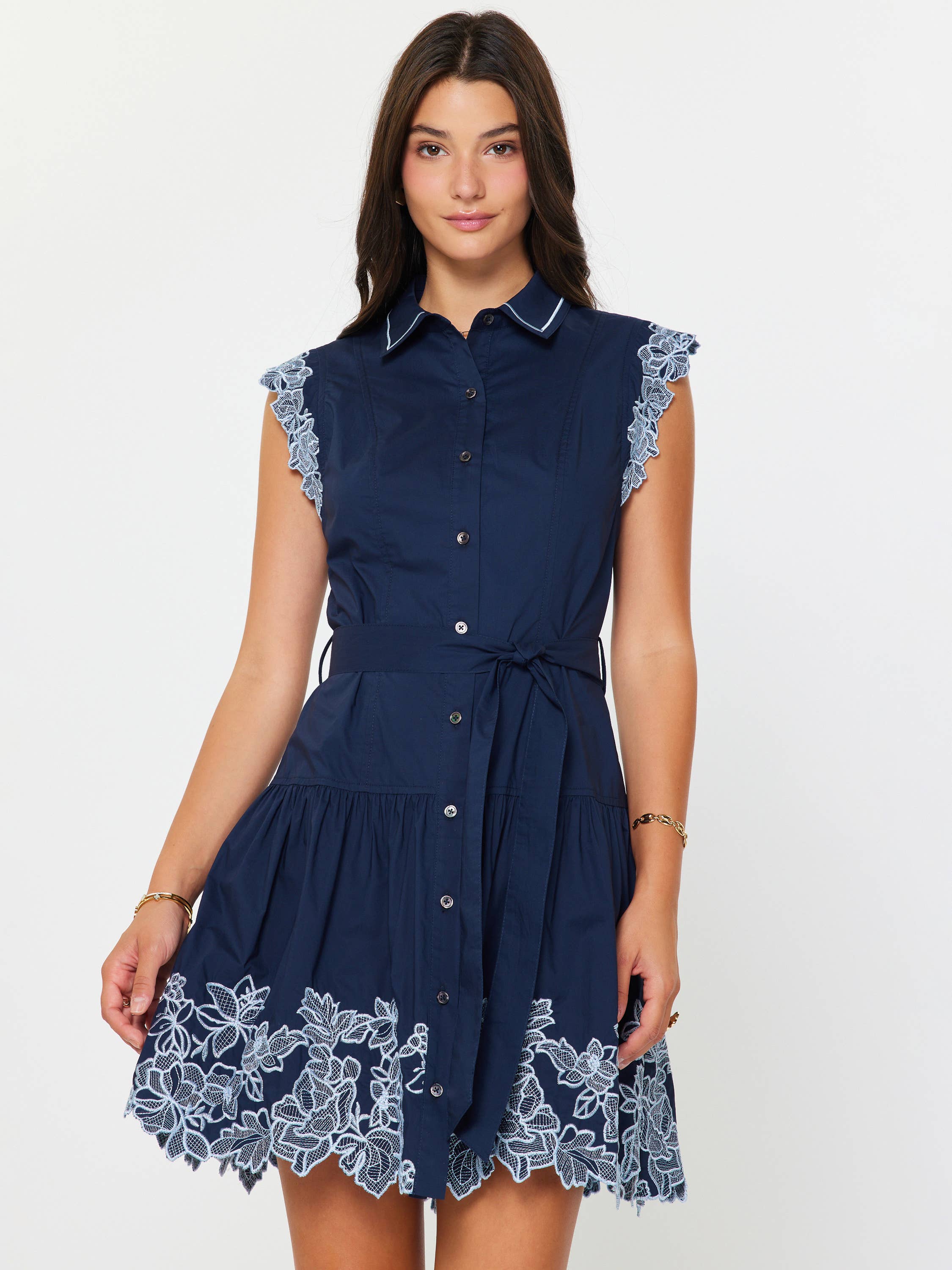 -Collar neckline with button-down front -Short cap sleeves design with lace trim edge -Removable waist selt belt -Tiered skirt with gathered detail -Mini length design -Gentle cycle wash in cold water