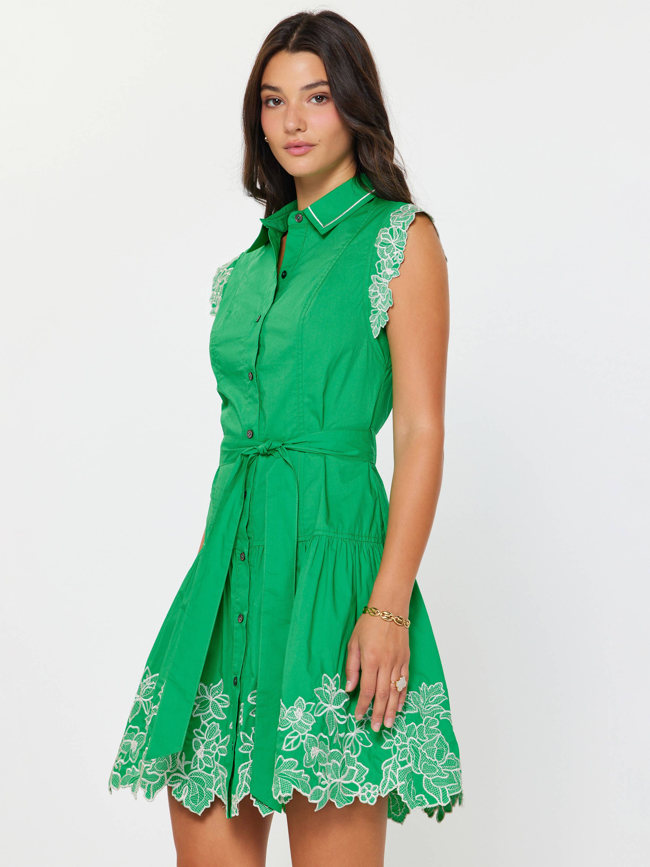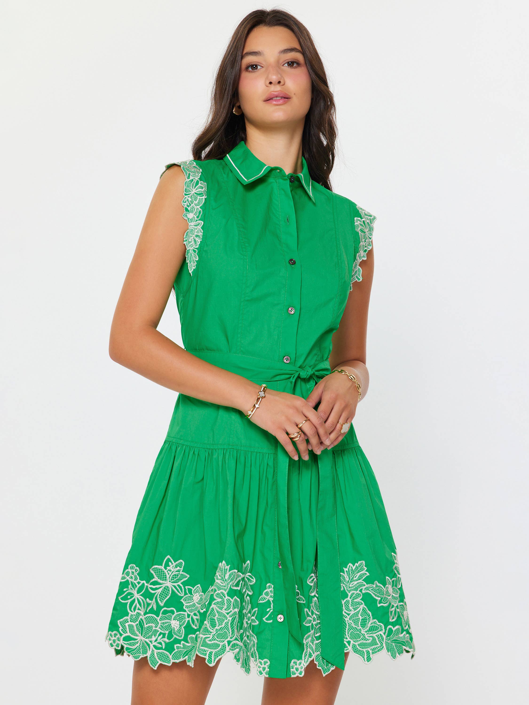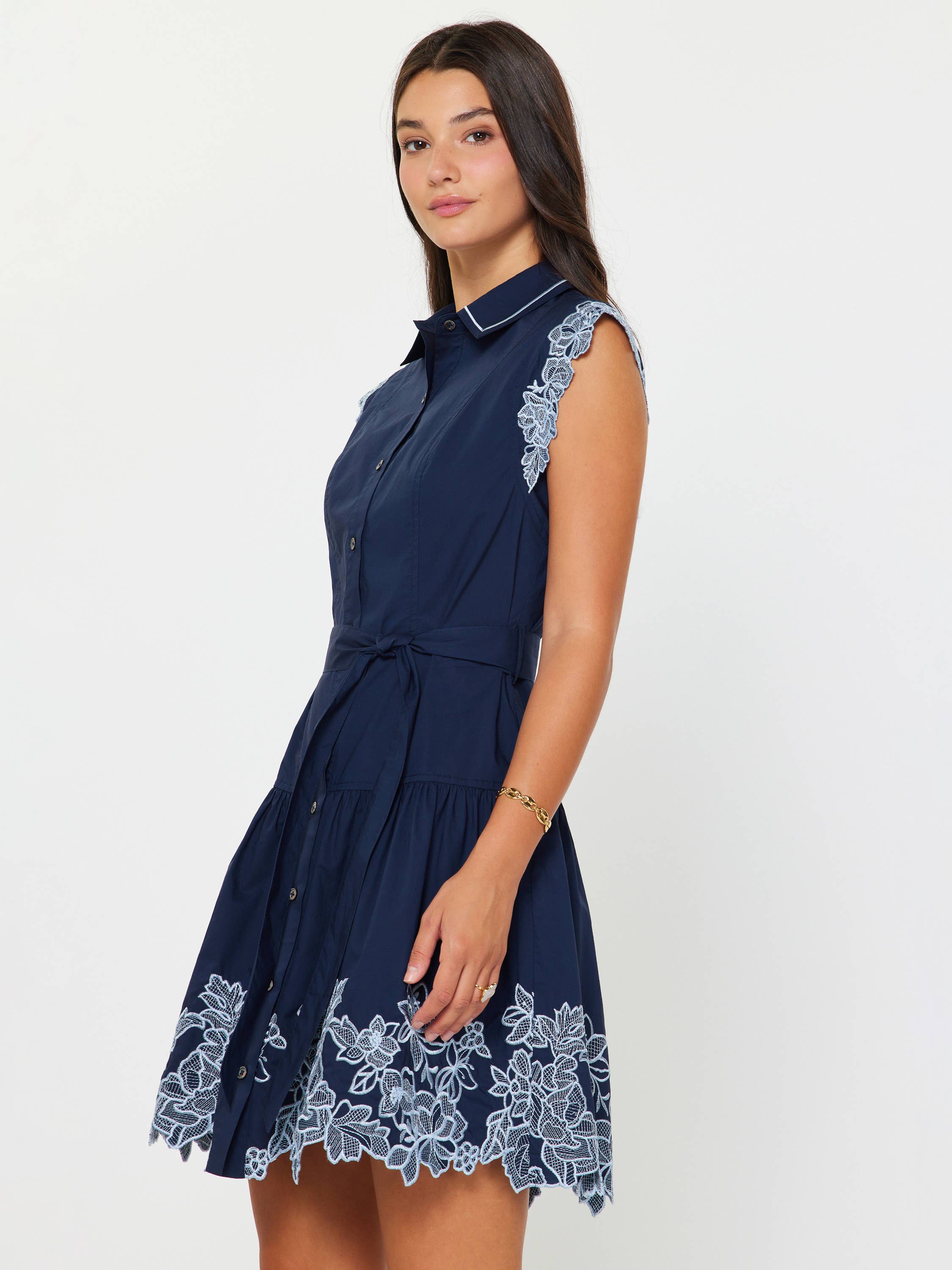 -Collar neckline with button-down front -Short cap sleeves design with lace trim edge -Removable waist selt belt -Tiered skirt with gathered detail -Mini length design -Gentle cycle wash in cold water