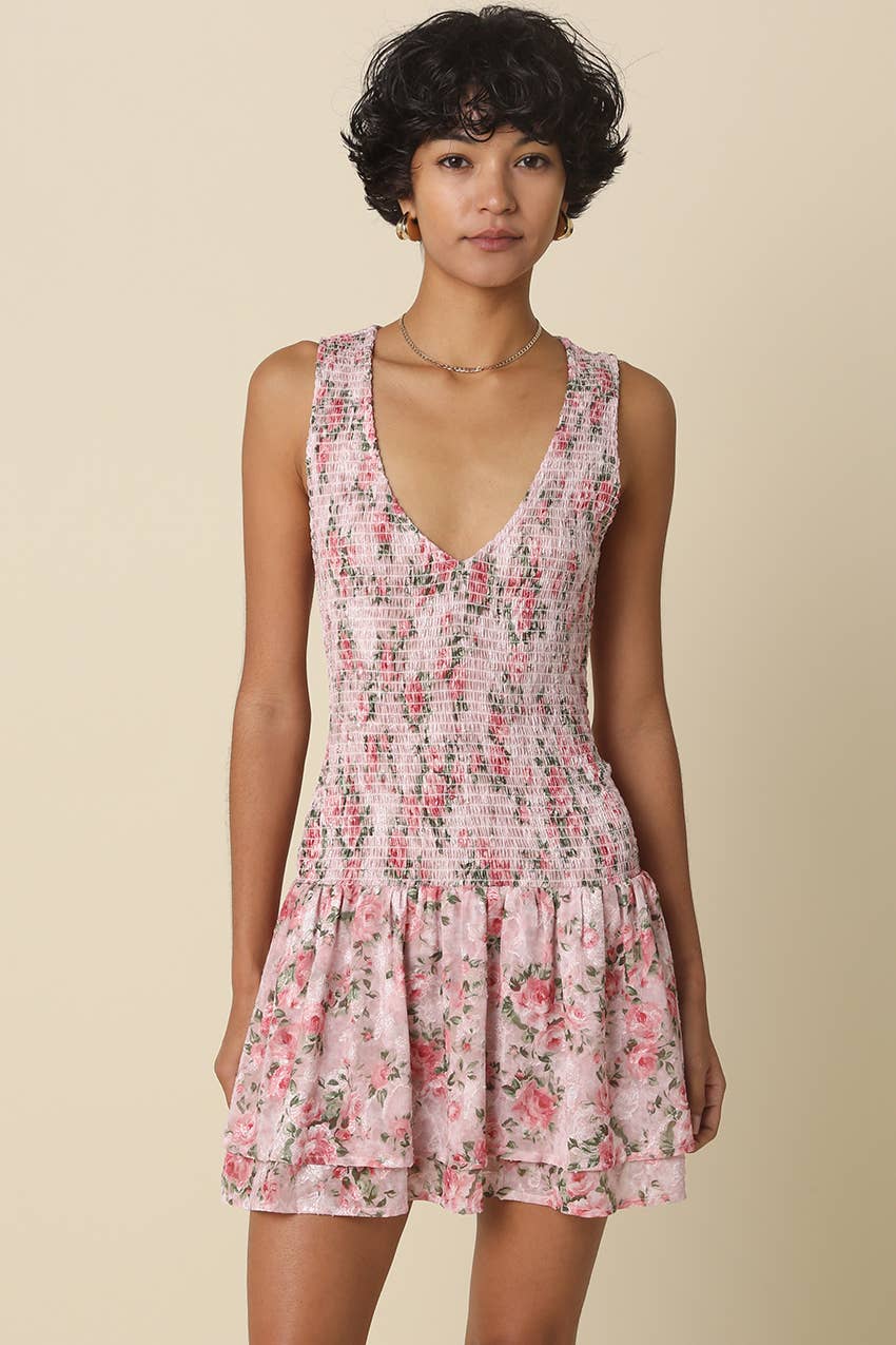 Our Riley Floral V-Neck Tiered Mini Dress features a sleeveless V neckline with a fitted, smocked bodice that defines a body line, and softly gathered tiered skirt for for a flared mini silhouette and feminine touch. Woven