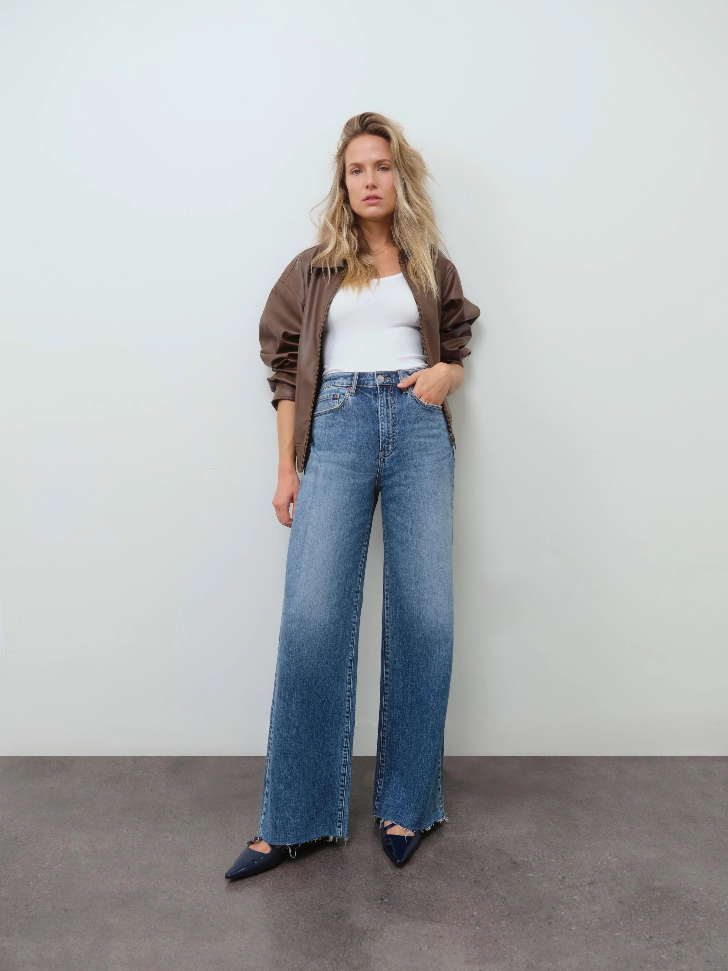 The cool girl jean, Far Out is a baggy and modern silhouette with vintage character. In a waist defining high rise and a detailed medium wash, this relaxed fit it is constructed in our "Tough Love" denim, that gives the vintage feeling of rigid structure, with just a touch of stretch.