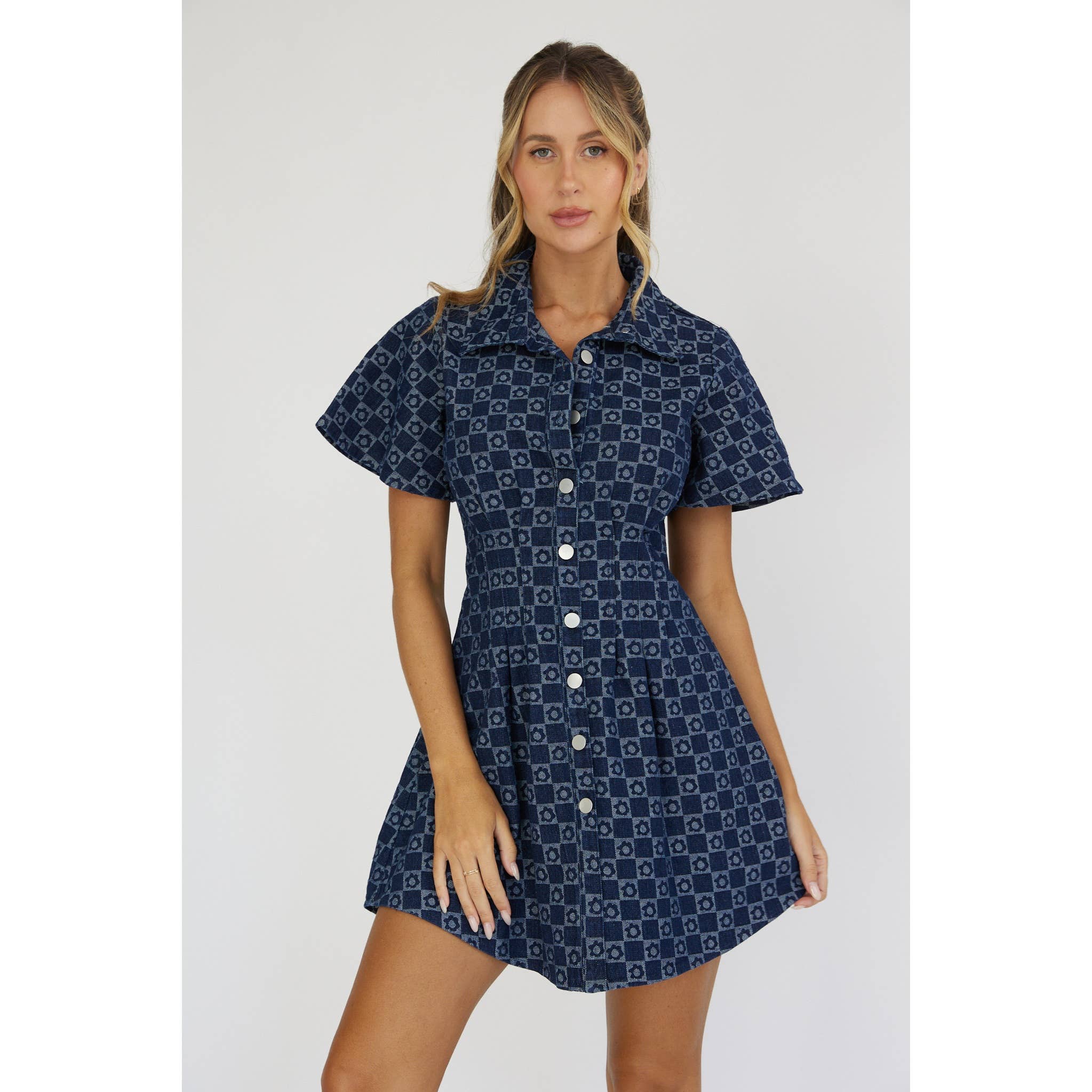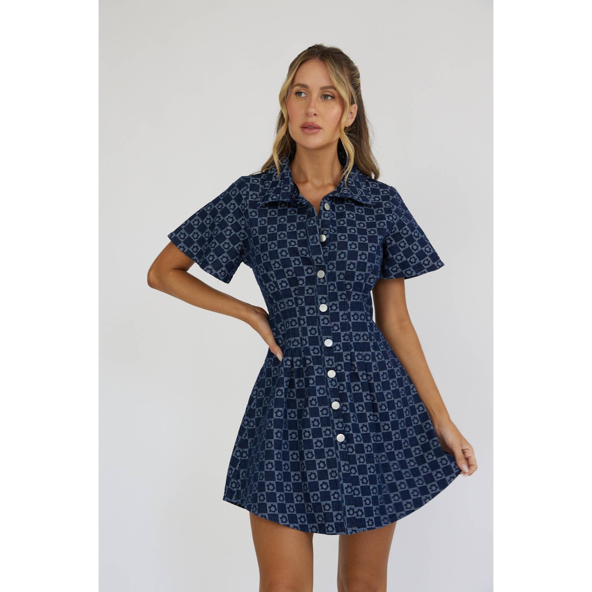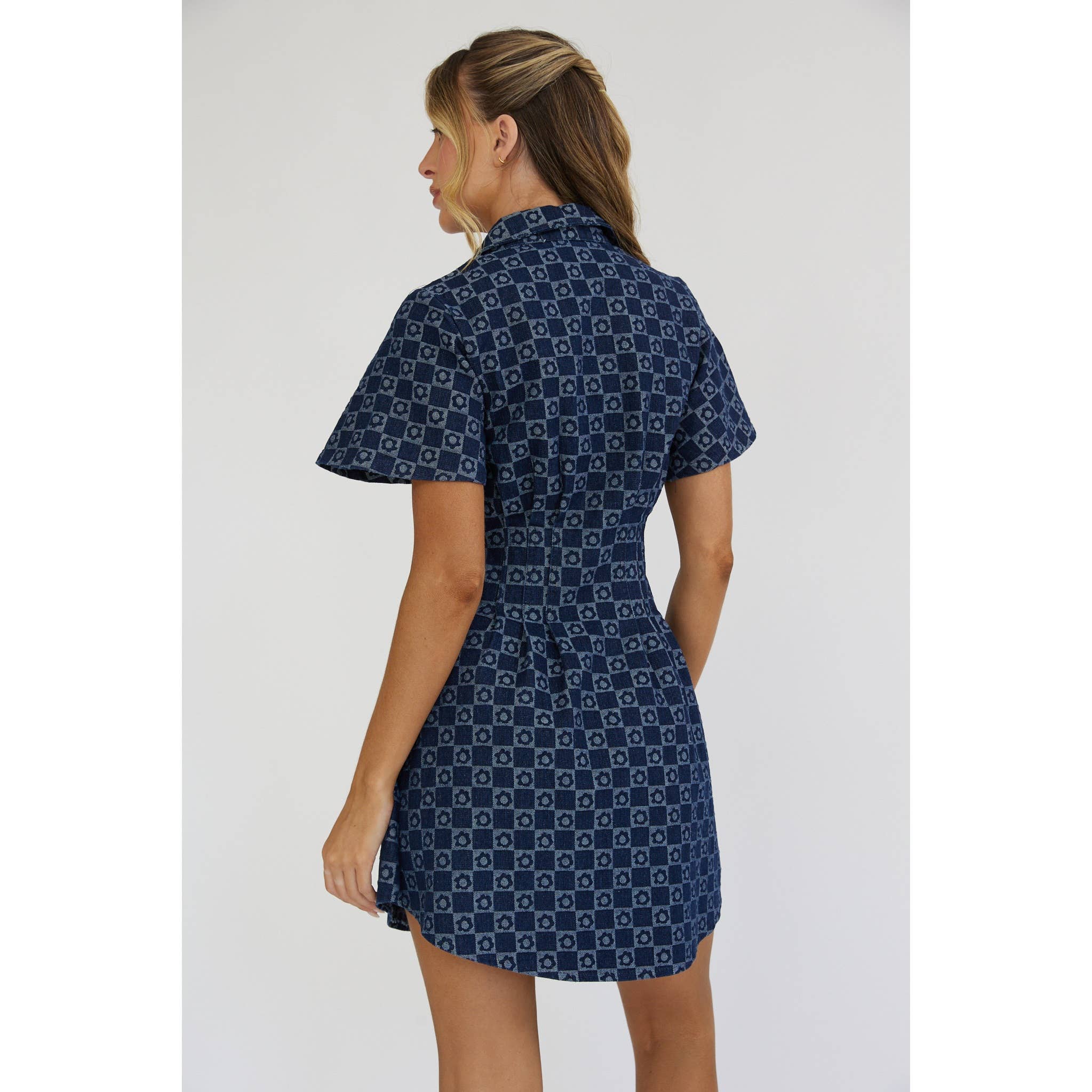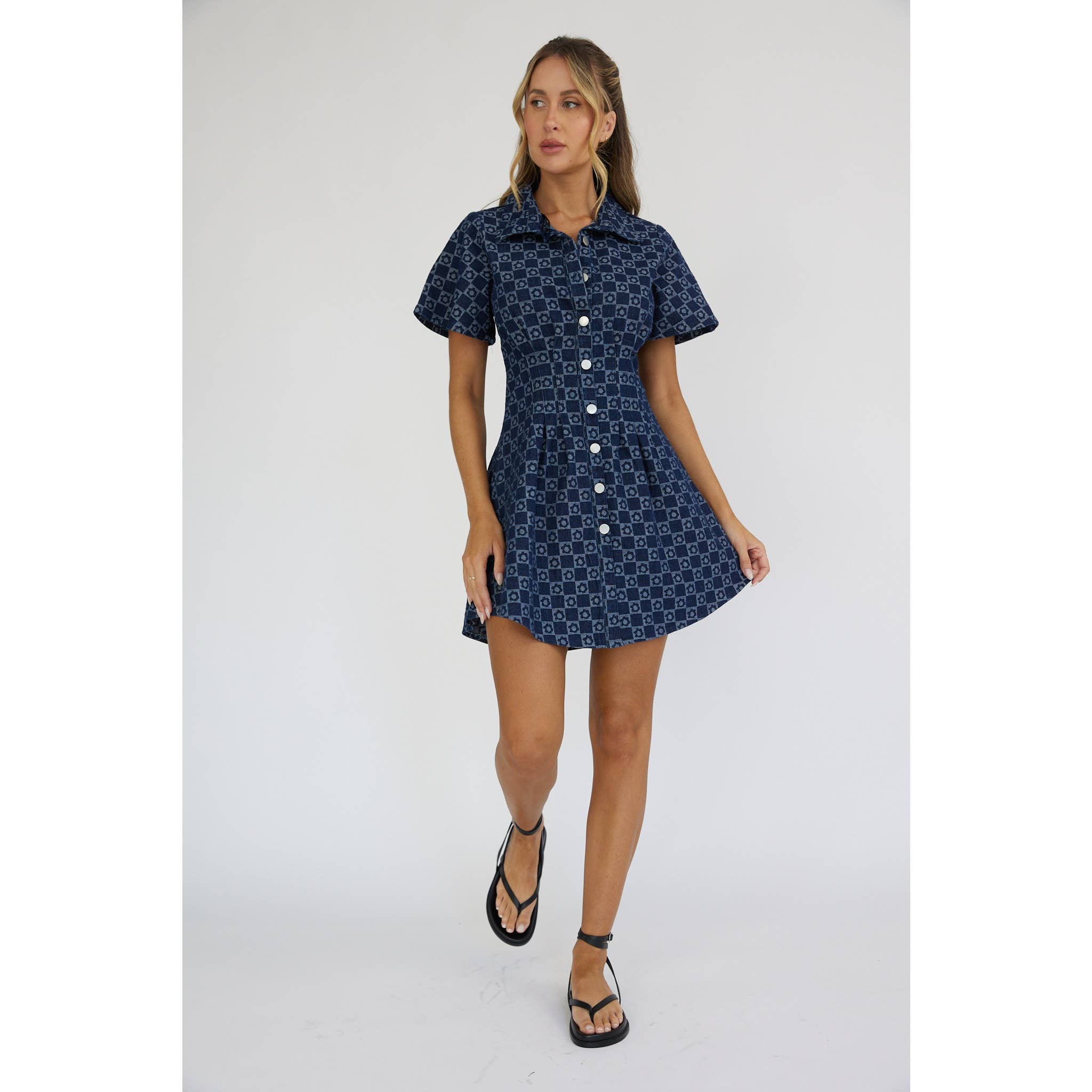 This is a short, fitted mini dress made from denim fabric with a distinctive all-over monogram pattern. The pattern consists of repeating stylized floral arranged in a checkerboard-like grid, creating a textured, tonal dark-blue-on-blue effect. The fitted bodice that flares out into a short A-line skirt.