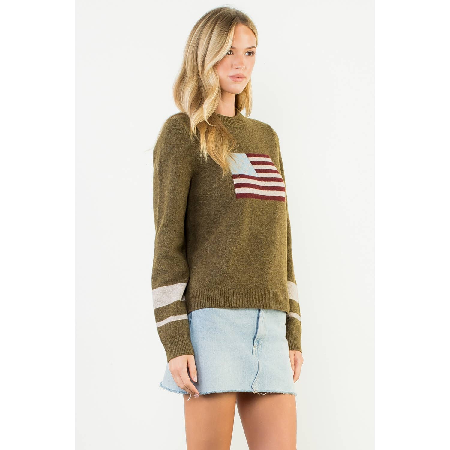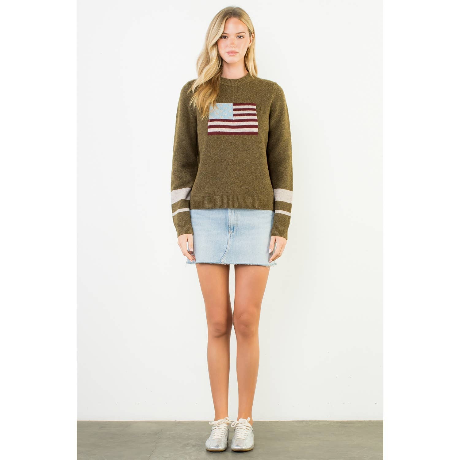 Knit Flag Detailed Sweater . / Style Measurements for Size S / Designed in USA - Body Length: 23 1/4 in - Bust Width: 39 in - Sleeve Length: 18 in . / Model Sizes - Wearing Size S - Height 5' 9", Bust 32", Waist 25 1/2", Hips 36" .