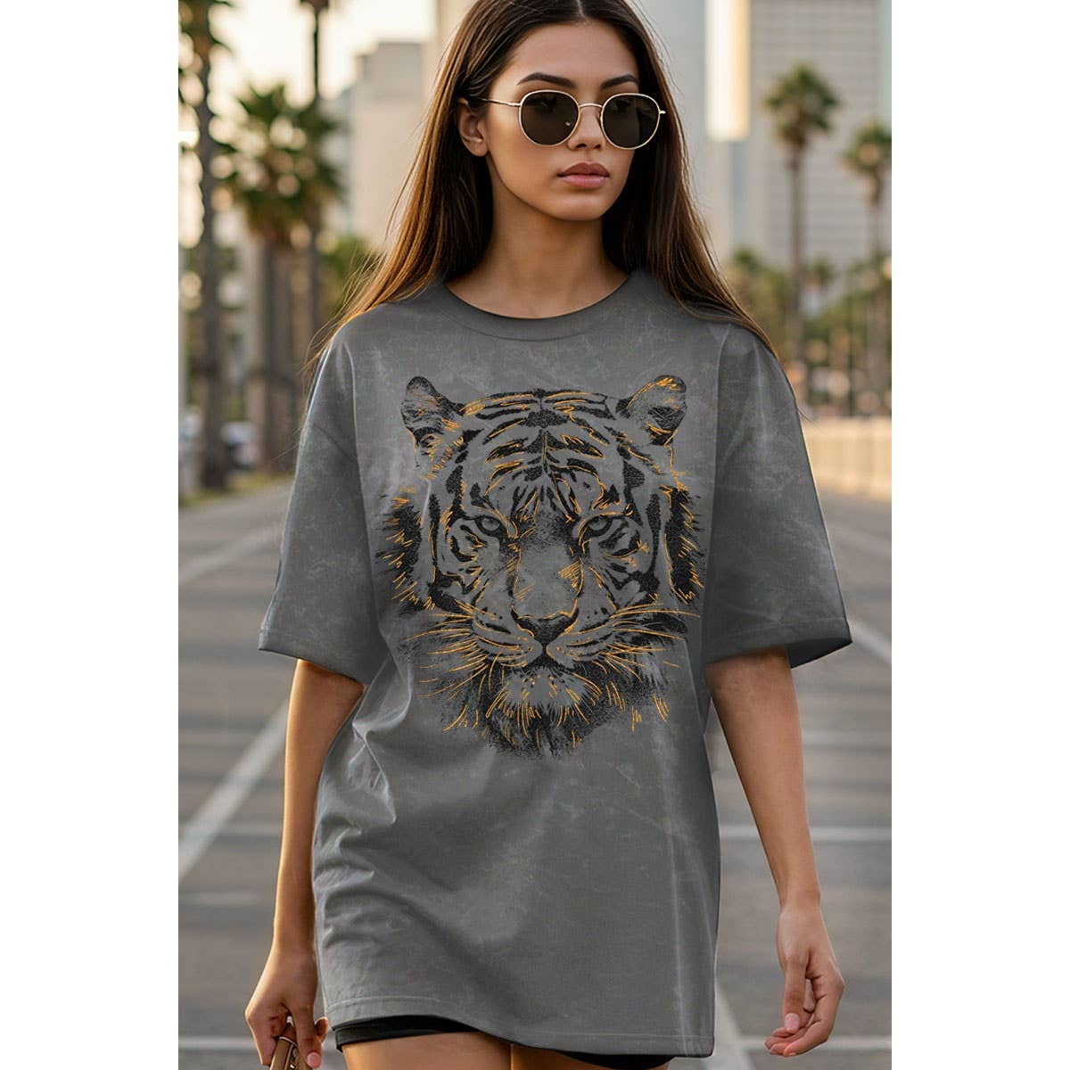 Women's cotton graphic oversized top with an authentic retro look and a super soft fabric feel that is only possible to achieve by adding our special mix of enzymes and mineral wash processes. It is ideal for everyday activities. This oversized tee features: - Pre-shrunk - Washing Instructions: - Cold water preferably like colors - No bleach - Tumble dry low - Model is wearing a size Small (LENGTH: 28" / BUST:45") Graphic tee & top garment dye. Screen printed t-shirts T SHIRTS , SHIRT, TIGER, BIGFACE, FOIL, WILD, ROAR