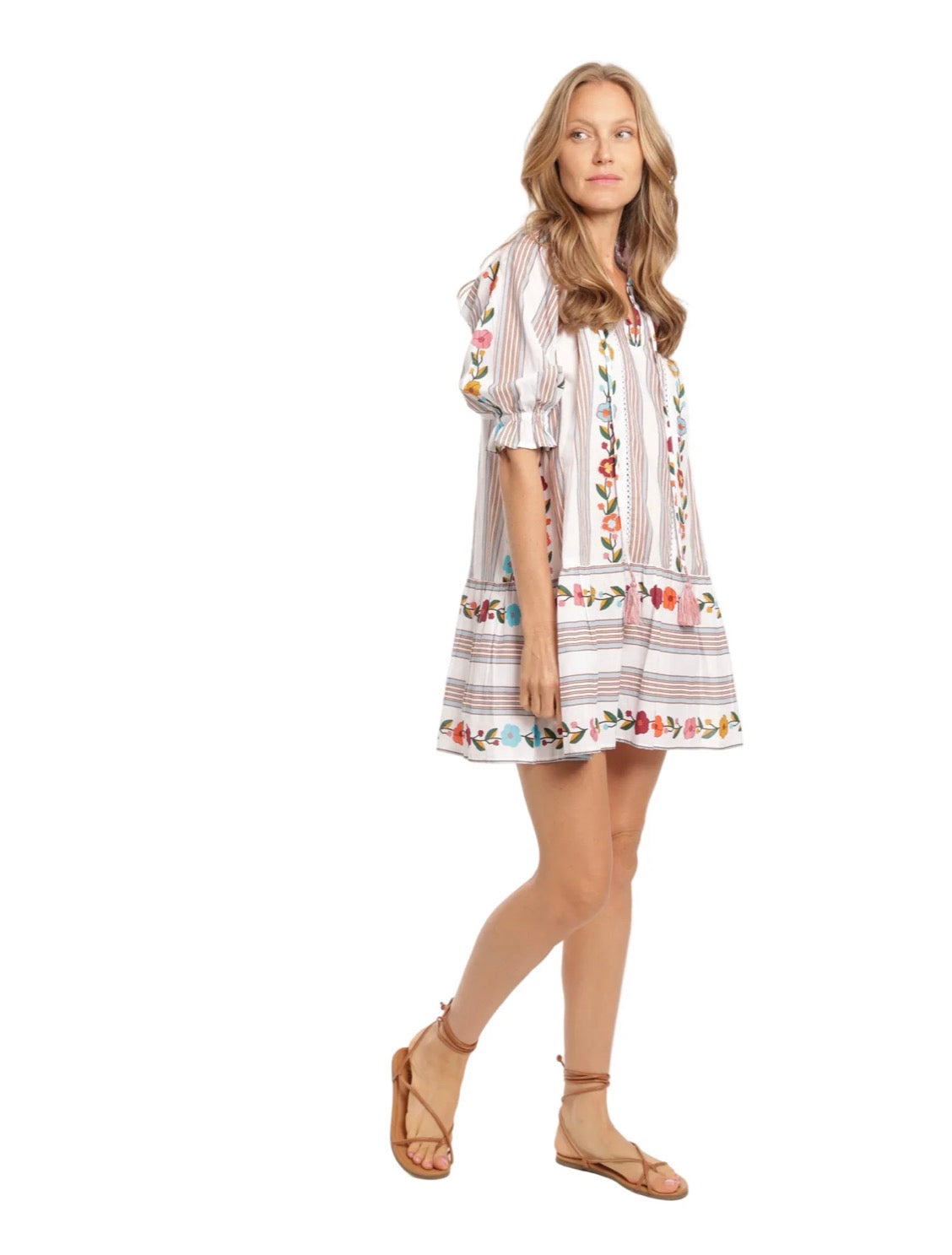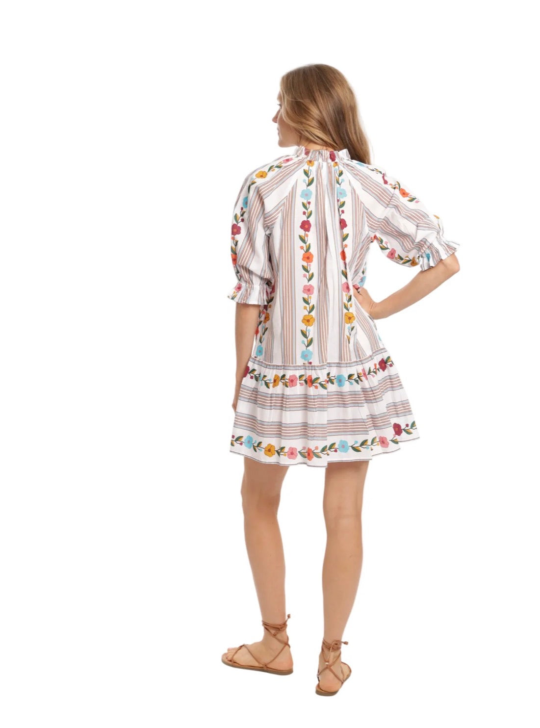 The Claire Dress in Multi is designed for effortless, throw-on-and-go dressing. Crafted from lightweight pure cotton, it features a relaxed, flattering silhouette with soft puff sleeves and a comfortable, easy fit. The neckline opens into a subtle V with delicate tassel ties, adding a feminine touch. Finished with a beautifully balanced mix of multicolour florals and striped borders, this dress feels playful yet polished—perfect for warm days, casual outings, and relaxed summer moments.