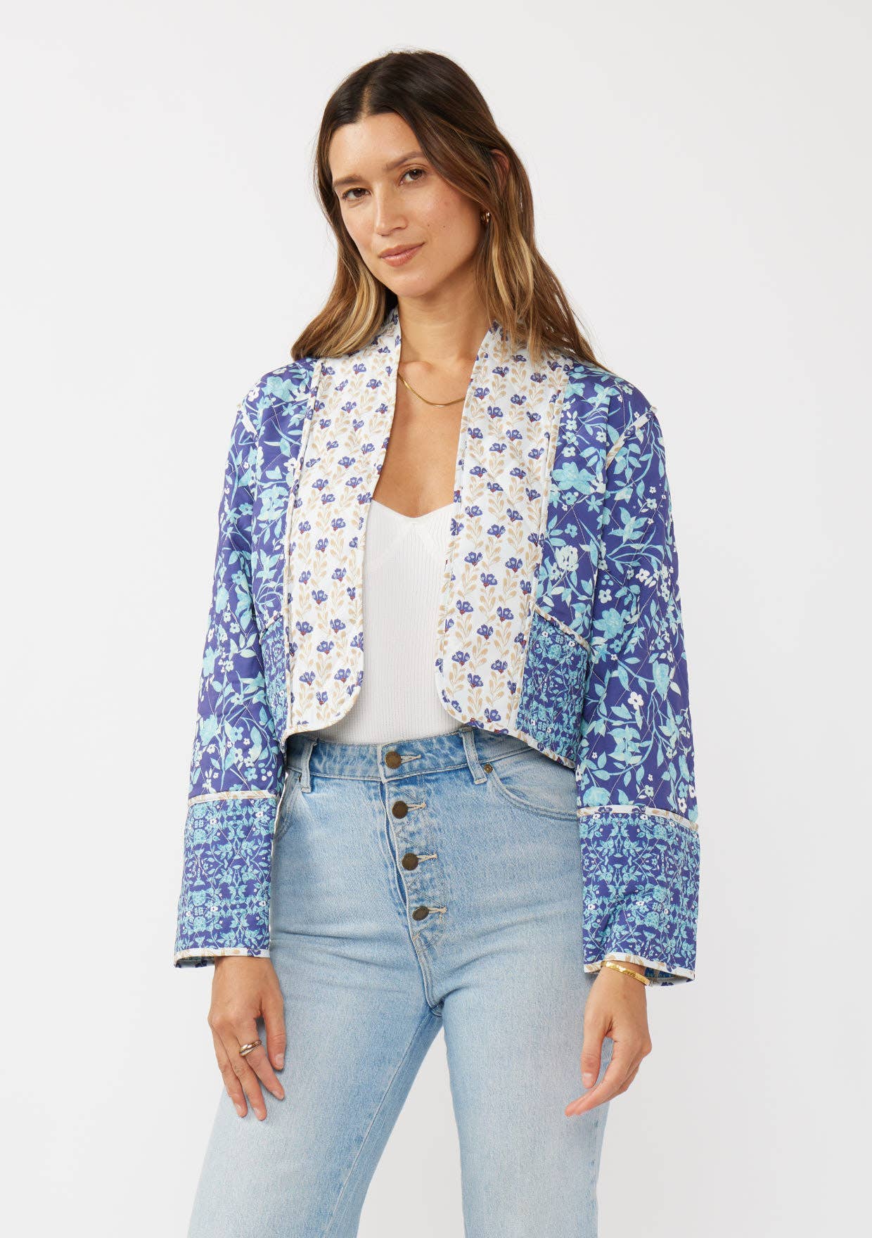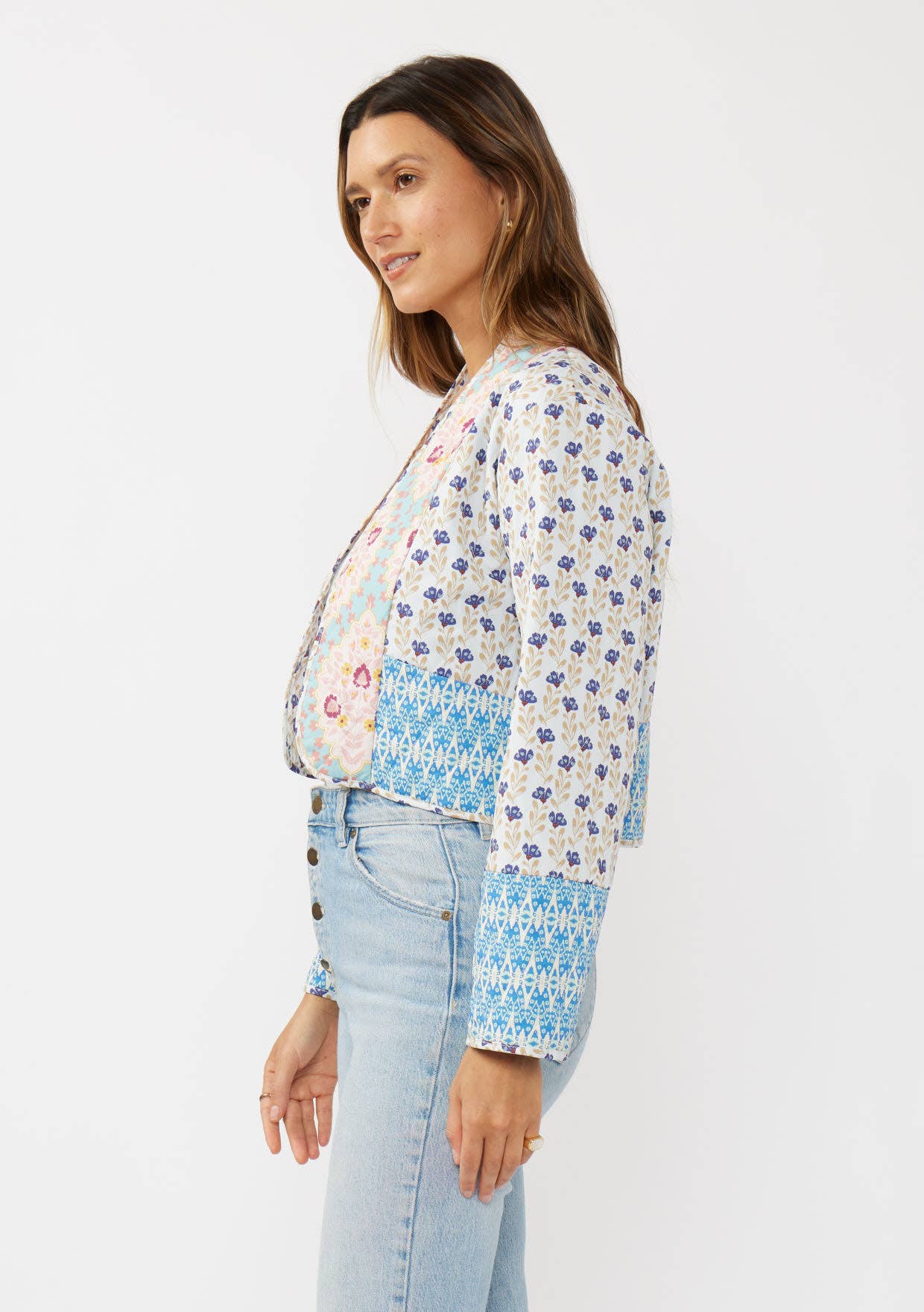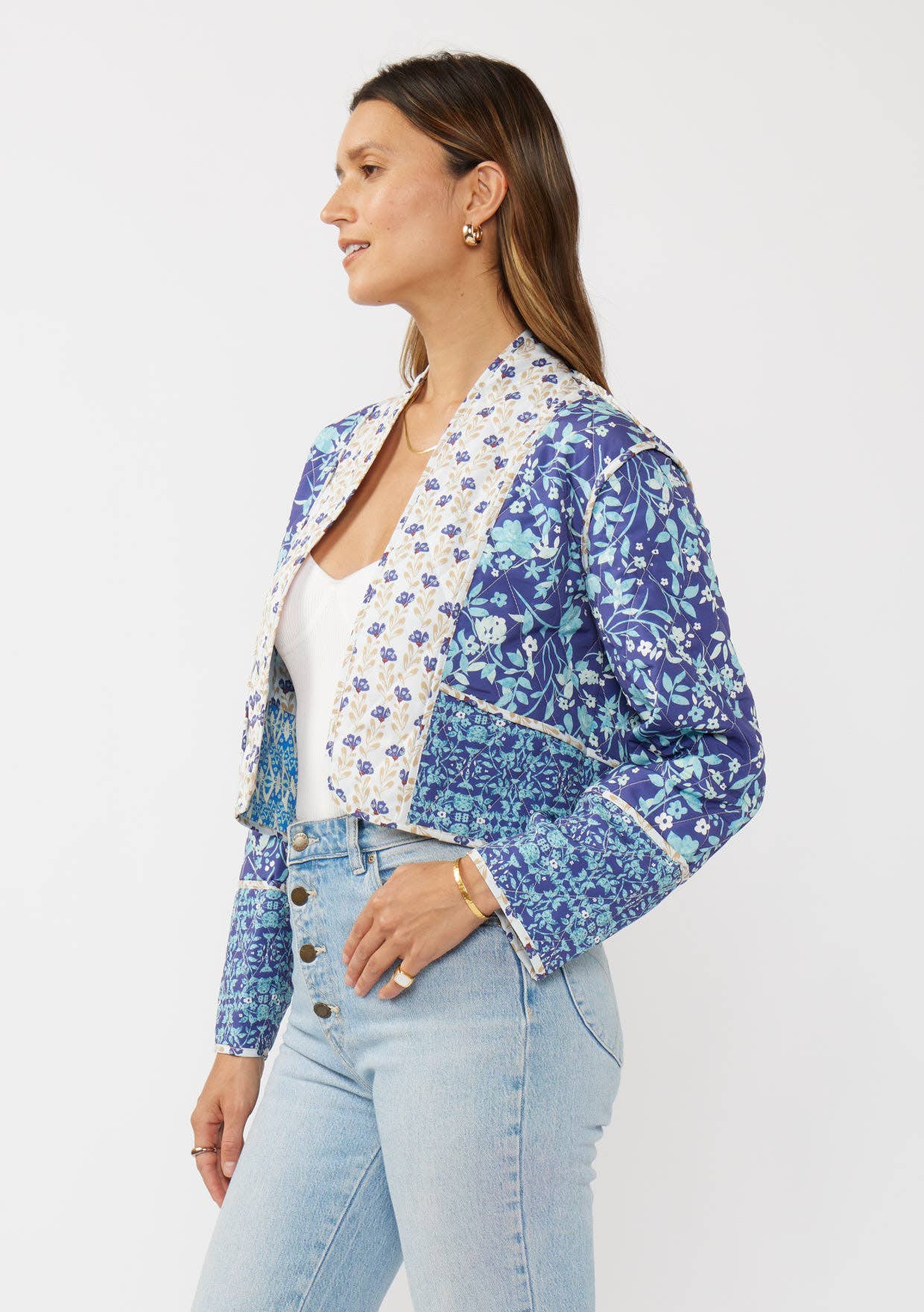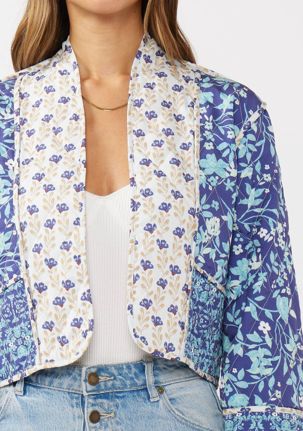 Available in XS. Extended sizing available upon request. Bring a fresh touch to your wardrobe with this reversible quilted jacket, featuring a vibrant floral print on both sides, all-over quilt stitching, and a collarless design. With its long sleeves and cropped length, this structured piece is the perfect layering option for cool spring days, combining functionality with effortless charm.