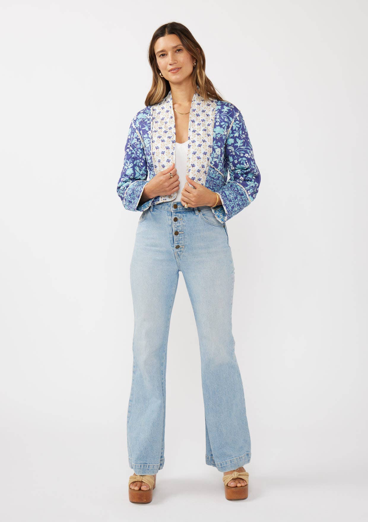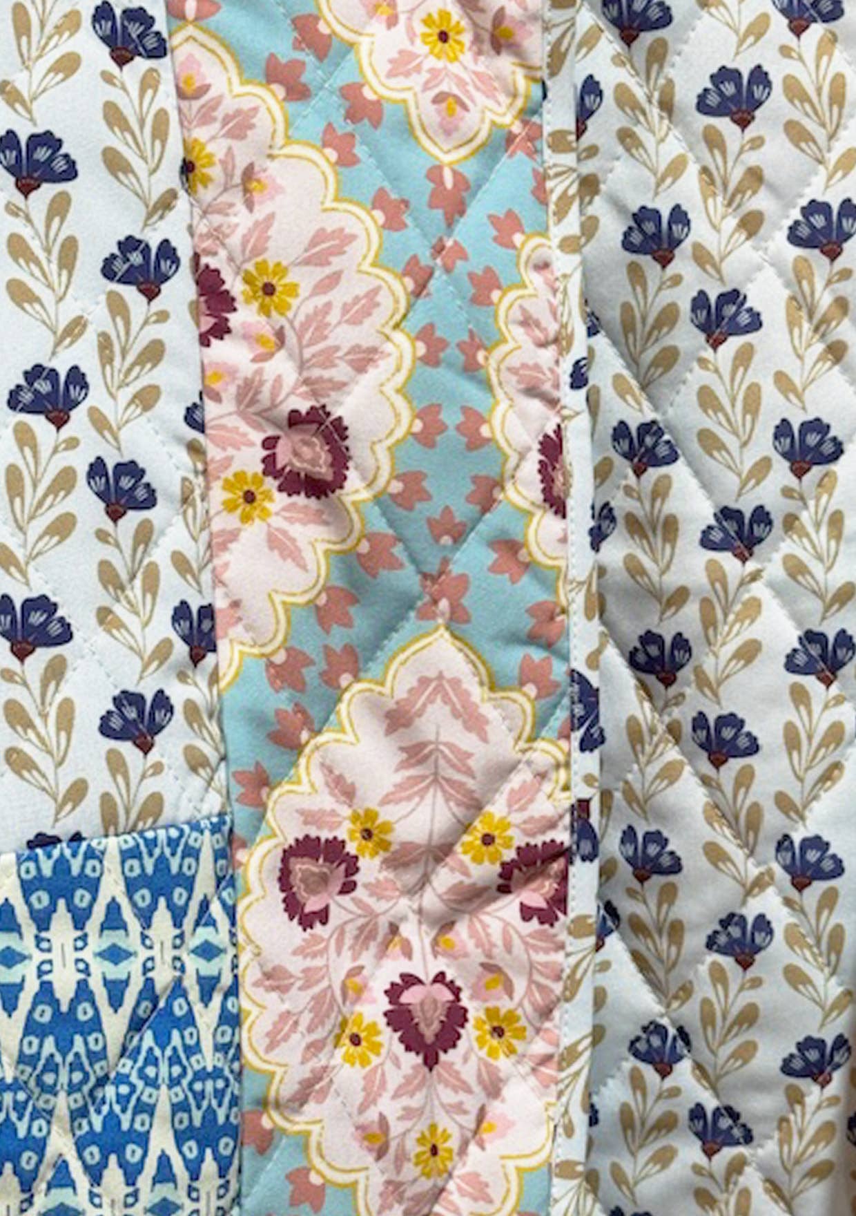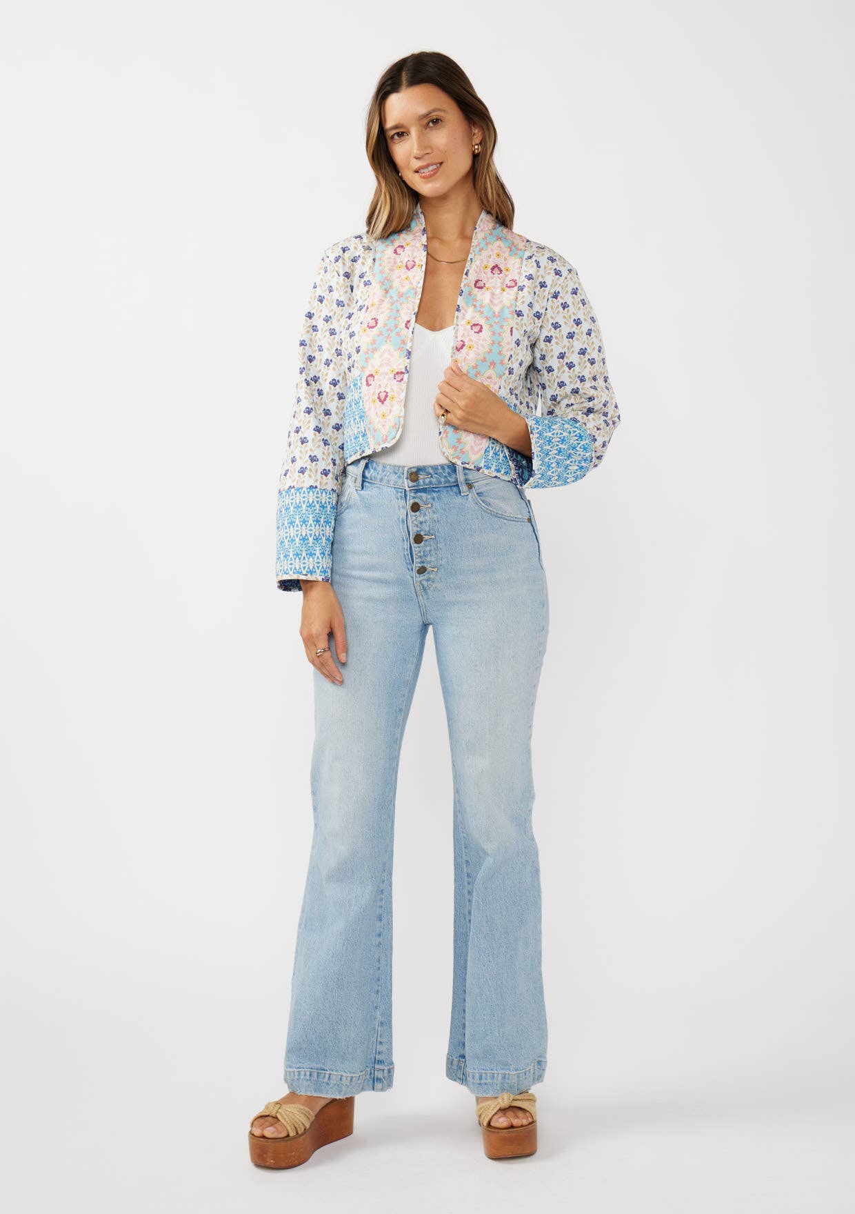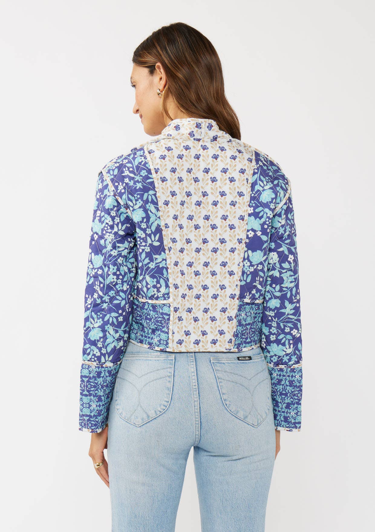 Available in XS. Extended sizing available upon request. Bring a fresh touch to your wardrobe with this reversible quilted jacket, featuring a vibrant floral print on both sides, all-over quilt stitching, and a collarless design. With its long sleeves and cropped length, this structured piece is the perfect layering option for cool spring days, combining functionality with effortless charm.