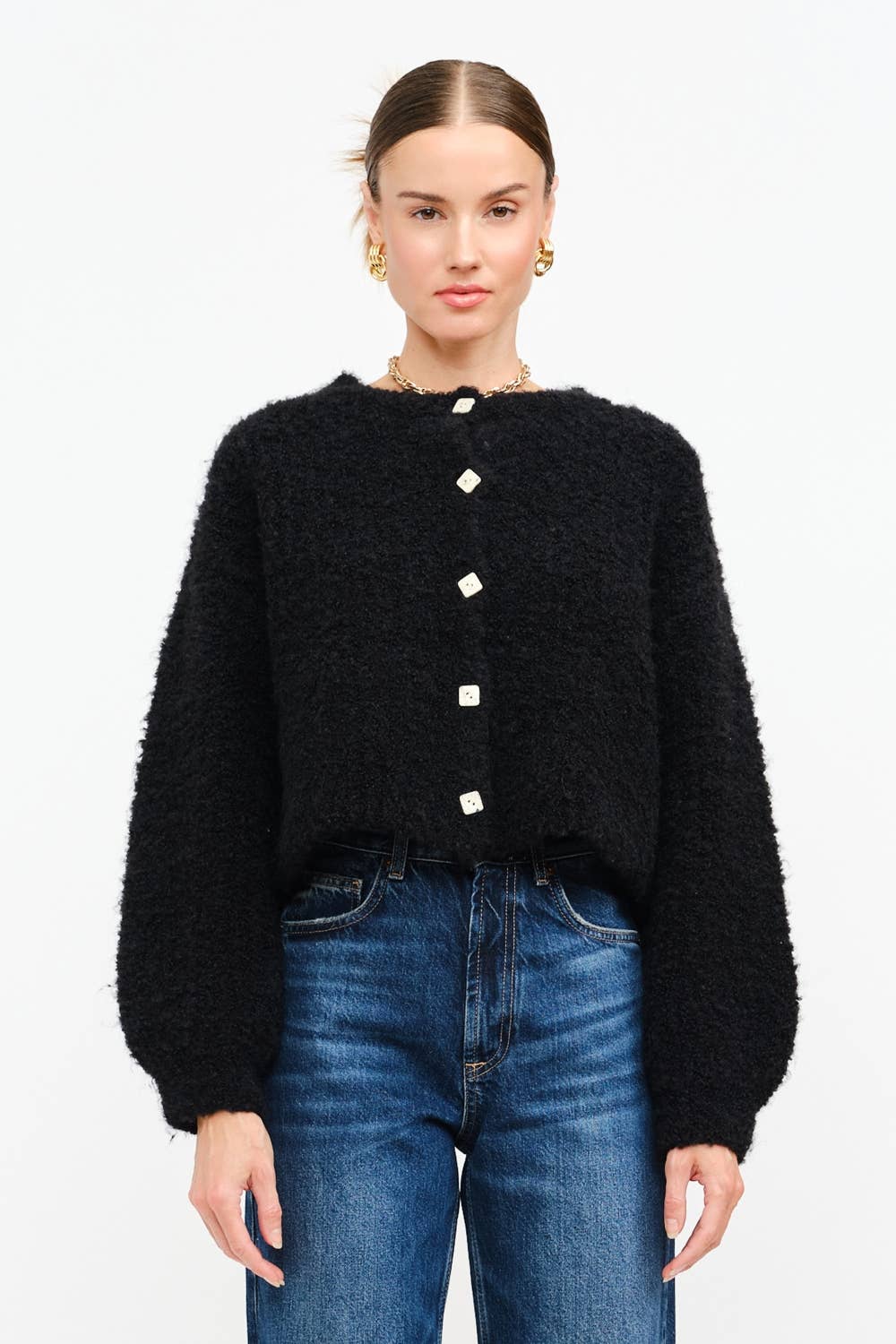 Rachel Black Cardigan: Classic, cozy, and endlessly versatile—this black cardigan is the chic layering piece you’ll reach for again and again. Designed in a soft textured knit with a relaxed fit, it features playful diagonal button detailing and a cropped silhouette for modern charm - Classic black textured knit - Cropped silhouette, easy to style - Relaxed long sleeves with gentle volume - Unique diagonal button-front closure - Square buttons add a modern, playful accent Care Instructions: - Hand wash cold - Do not bleach - Line dry - Iron low if needed - Do not tumble dry Fabric Content: 59% Polyester, 29% Acrylic, 9% Wool, 3% Spandex Model is 5'11" and is wearing a size small