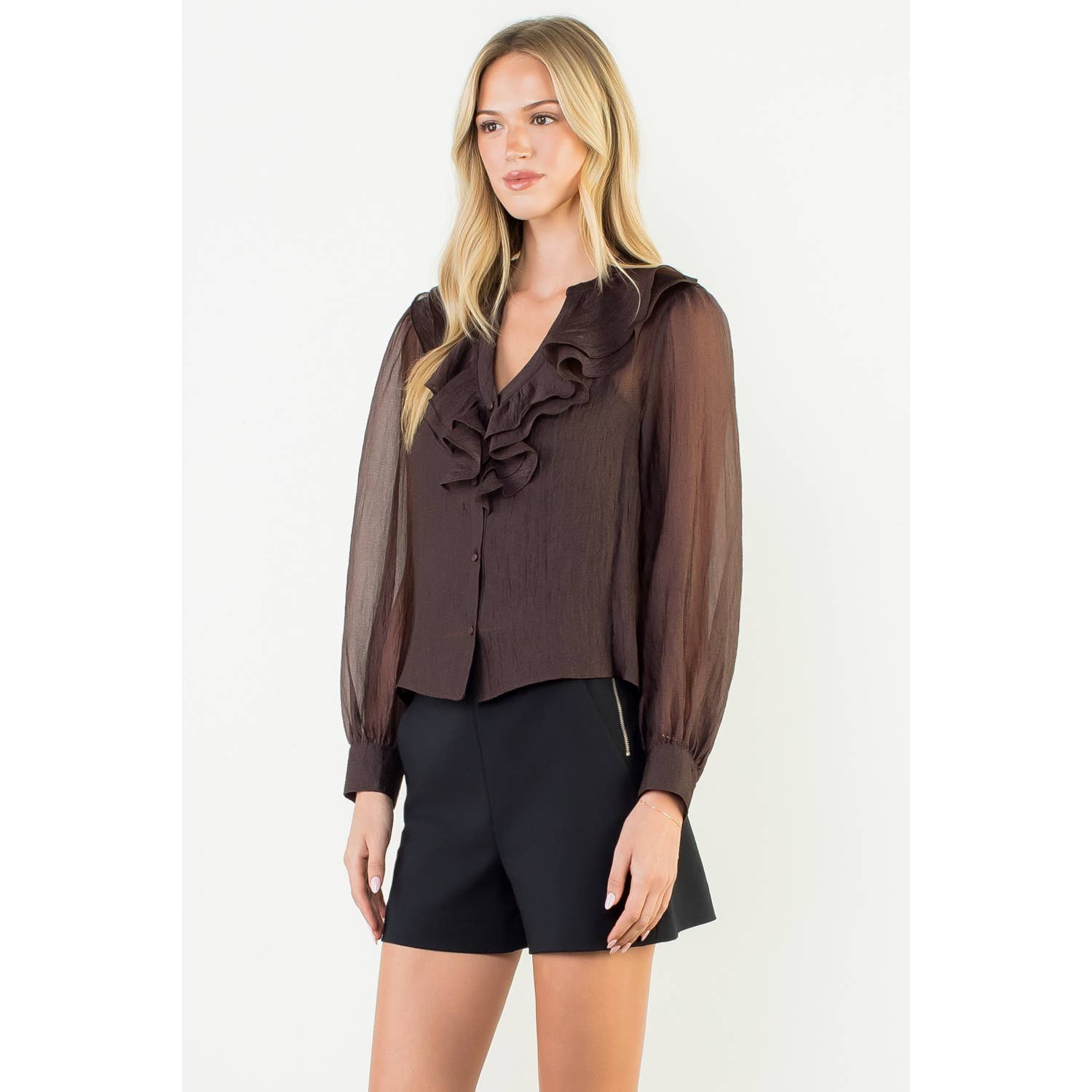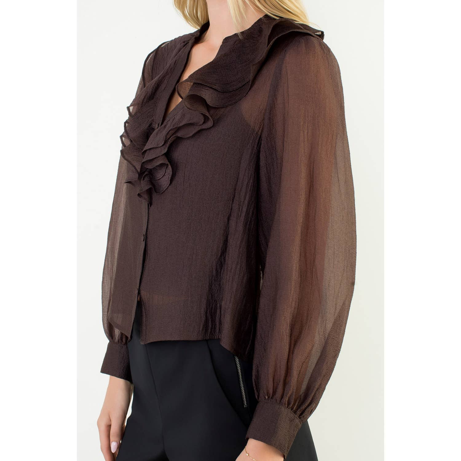 Ruffle Trim Sheer Long Sleeve Blouse . / Style Measurements for Size S / Designed in USA - Body Length: 22 in - Bust Width: 38 in - Sleeve Length: 25 1/2 in . / Model Sizes - Wearing Size S - Height 5' 9", Bust 32", Waist 25 1/2", Hips 36" . . / Fabric Content - WOVEN / 100% Polyester