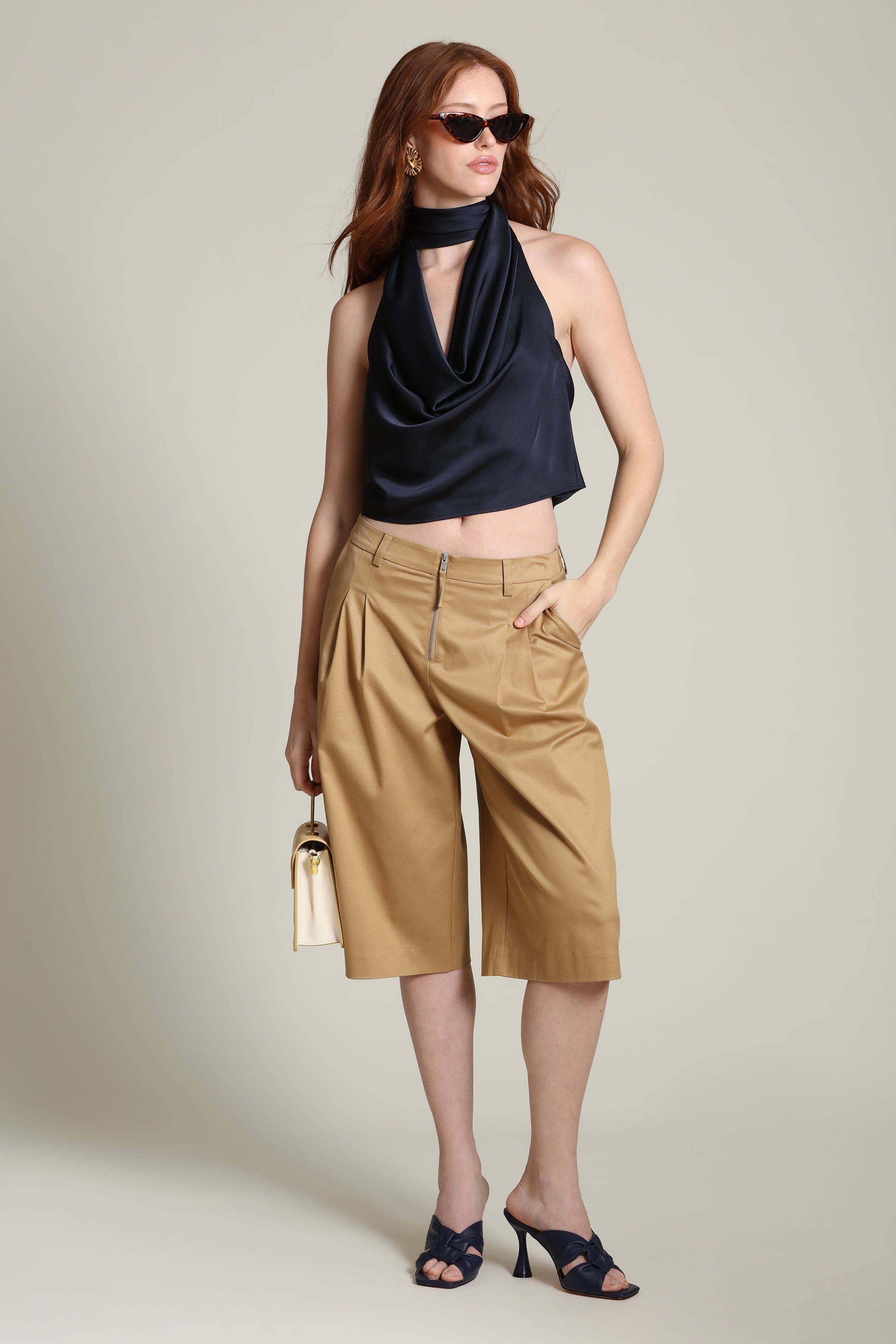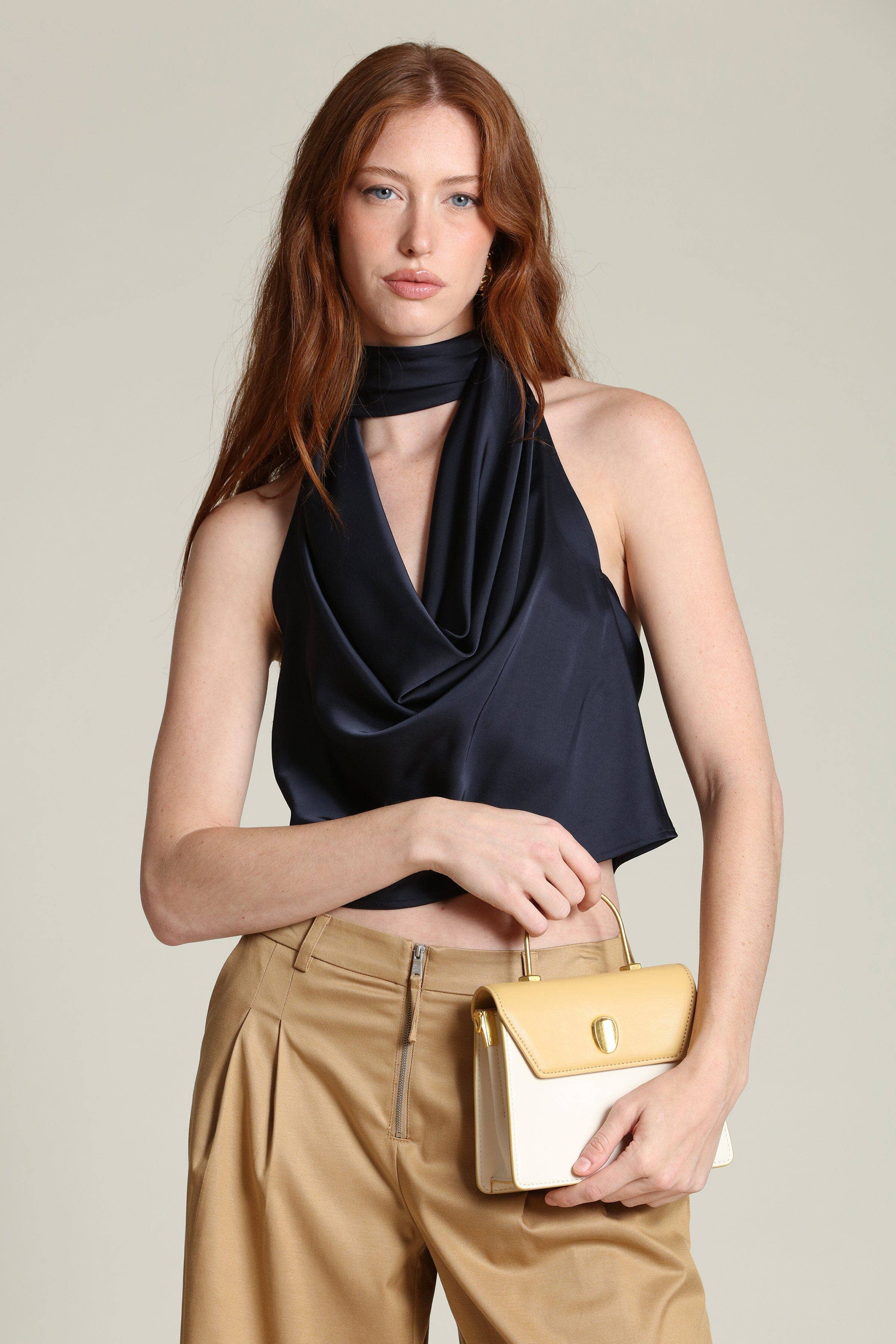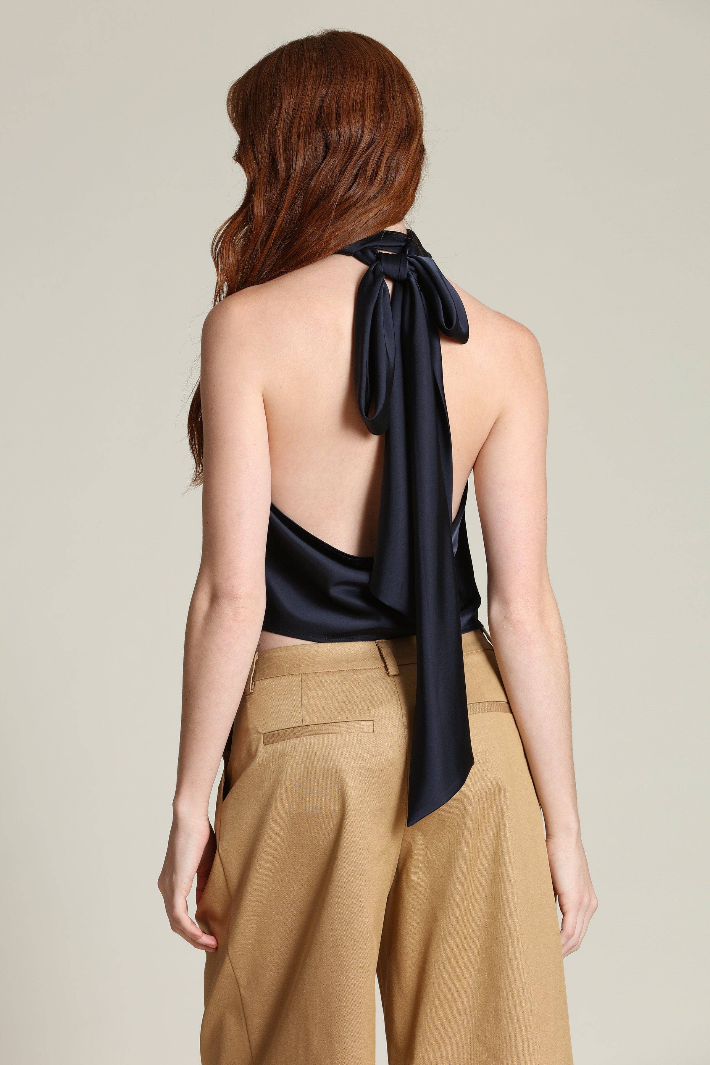 In classic navy blue, this satin halter top delivers effortless evening polish with a sleek, modern edge. Designed for rooftop cocktails, gallery openings, or elevated nights out, it pairs seamlessly with tailored trousers, leather skirts, or vintage denim for a timeless yet striking look.